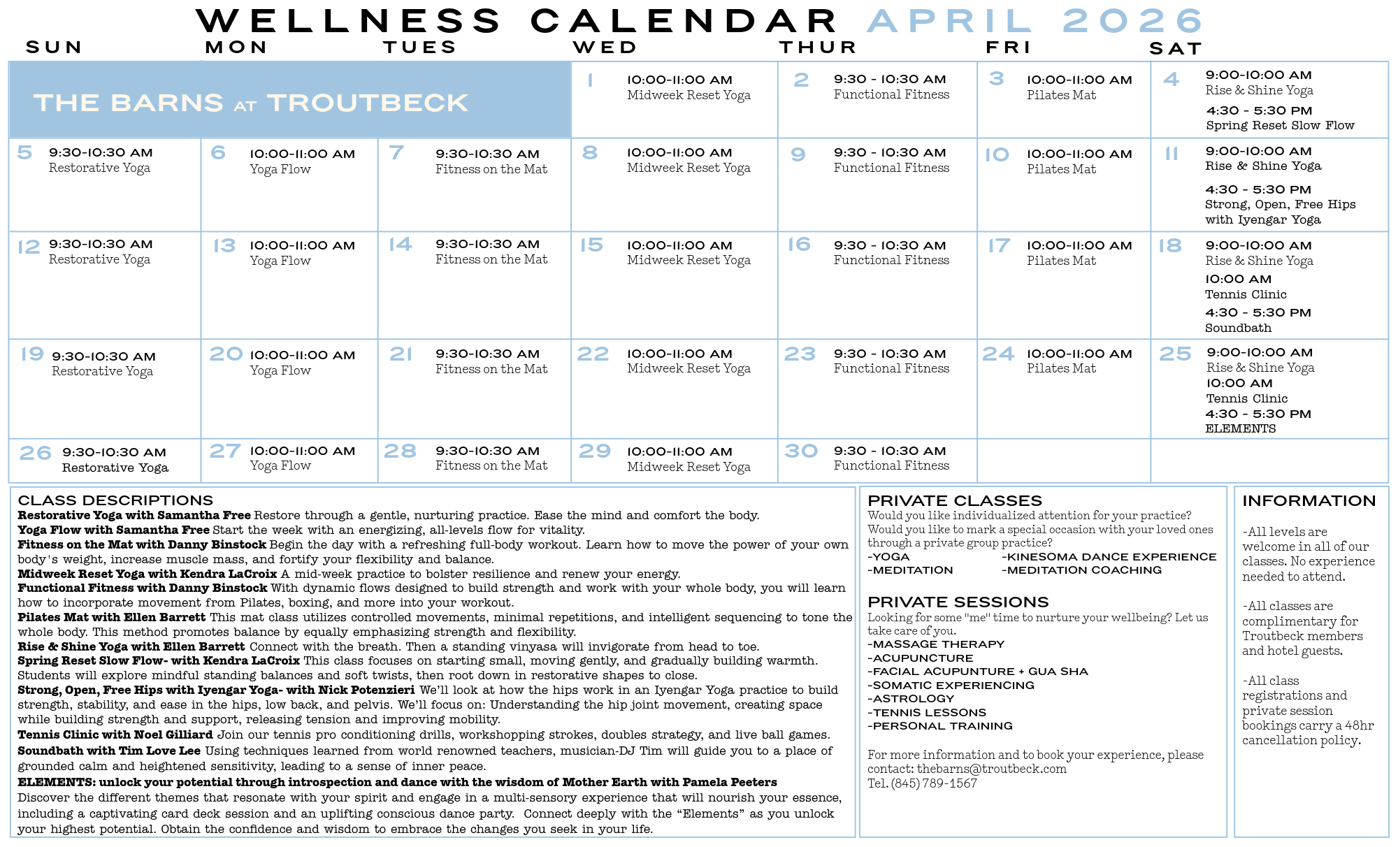 Unless otherwise noted, The Barns and classes are open to Members and in-house guests, free of charge. Please email to reseve a class or book a treatment.