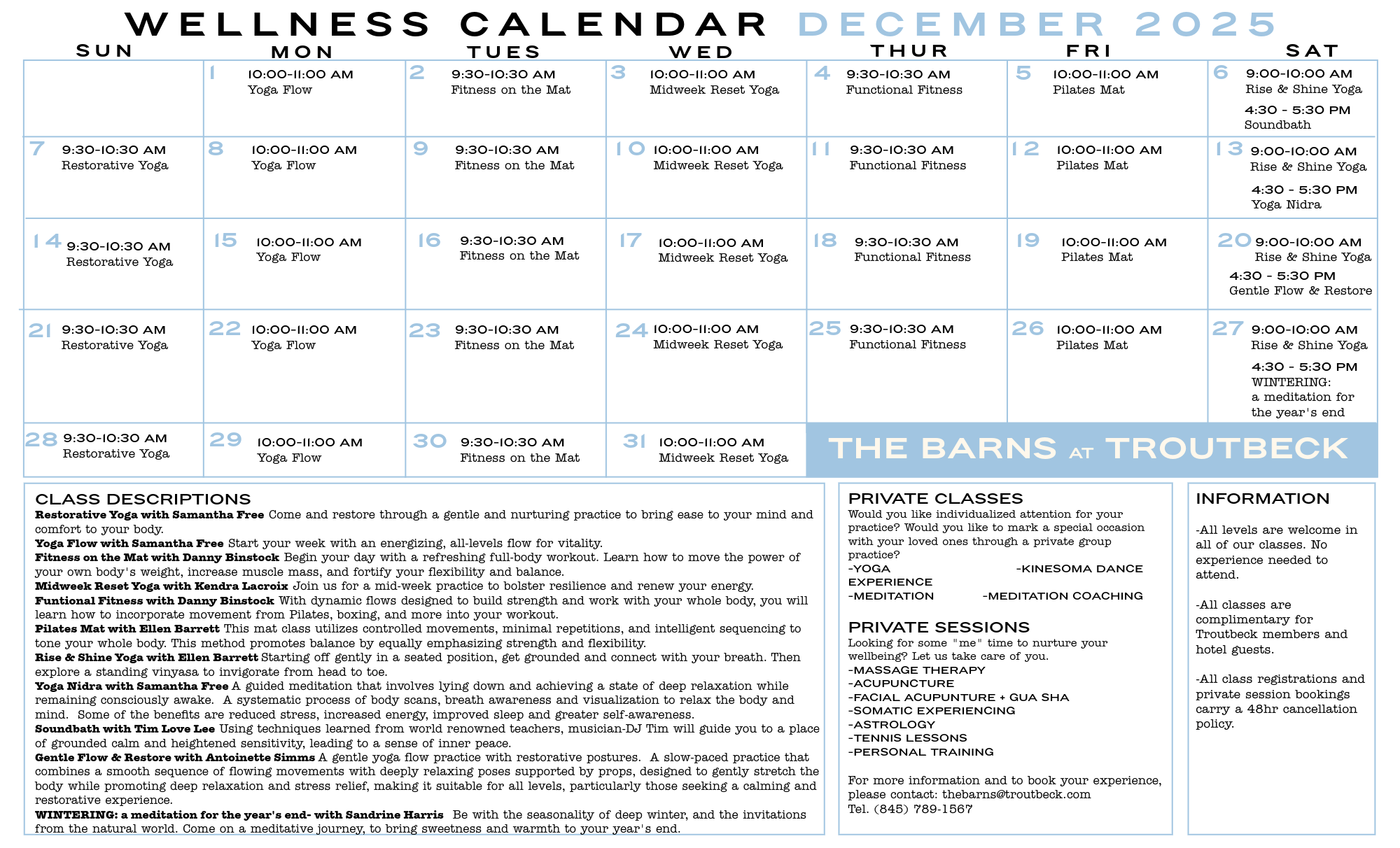 Unless otherwise noted, The Barns and classes are open to Members and in-house guests, free of charge. Please email to reseve a class or book a treatment.