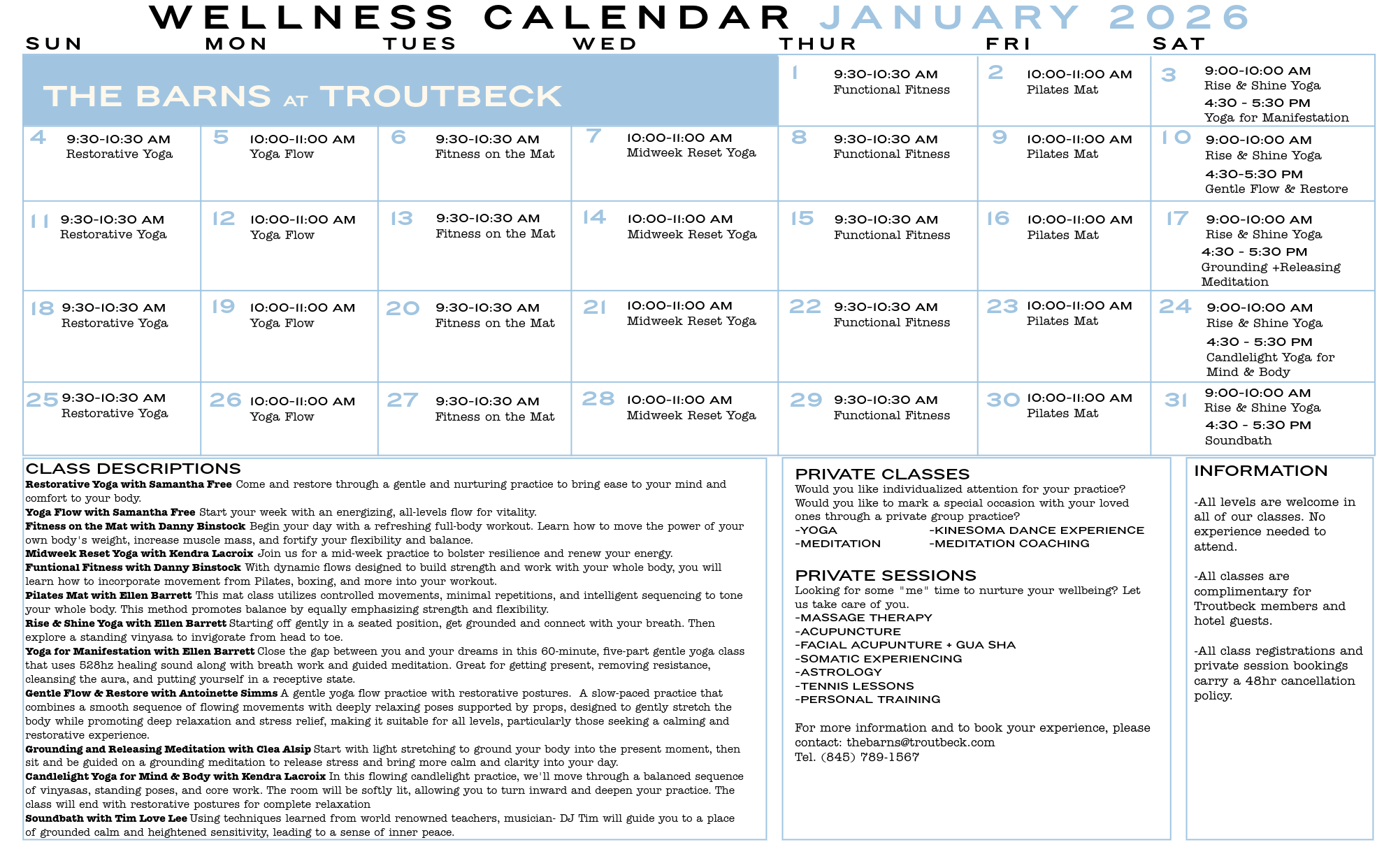 Unless otherwise noted, The Barns and classes are open to Members and in-house guests, free of charge. Please email to reseve a class or book a treatment.
