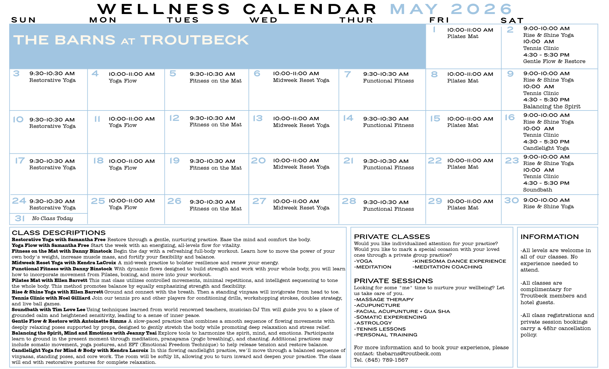 Unless otherwise noted, The Barns and classes are open to Members and in-house guests, free of charge. Please email to reseve a class or book a treatment.