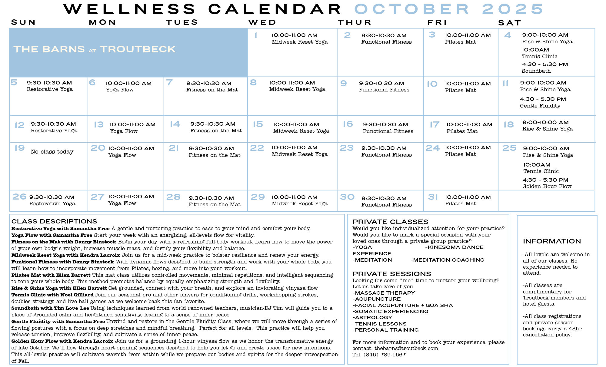 Unless otherwise noted, The Barns and classes are open to Members and in-house guests, free of charge. Please email to reseve a class or book a treatment.