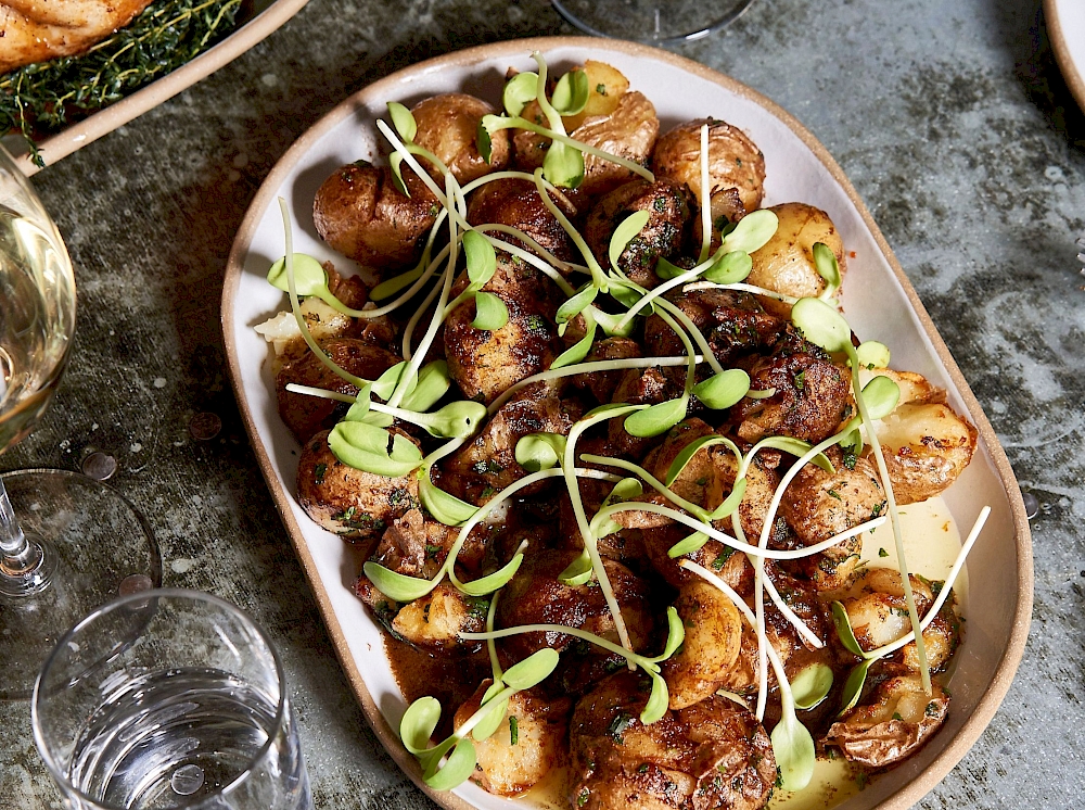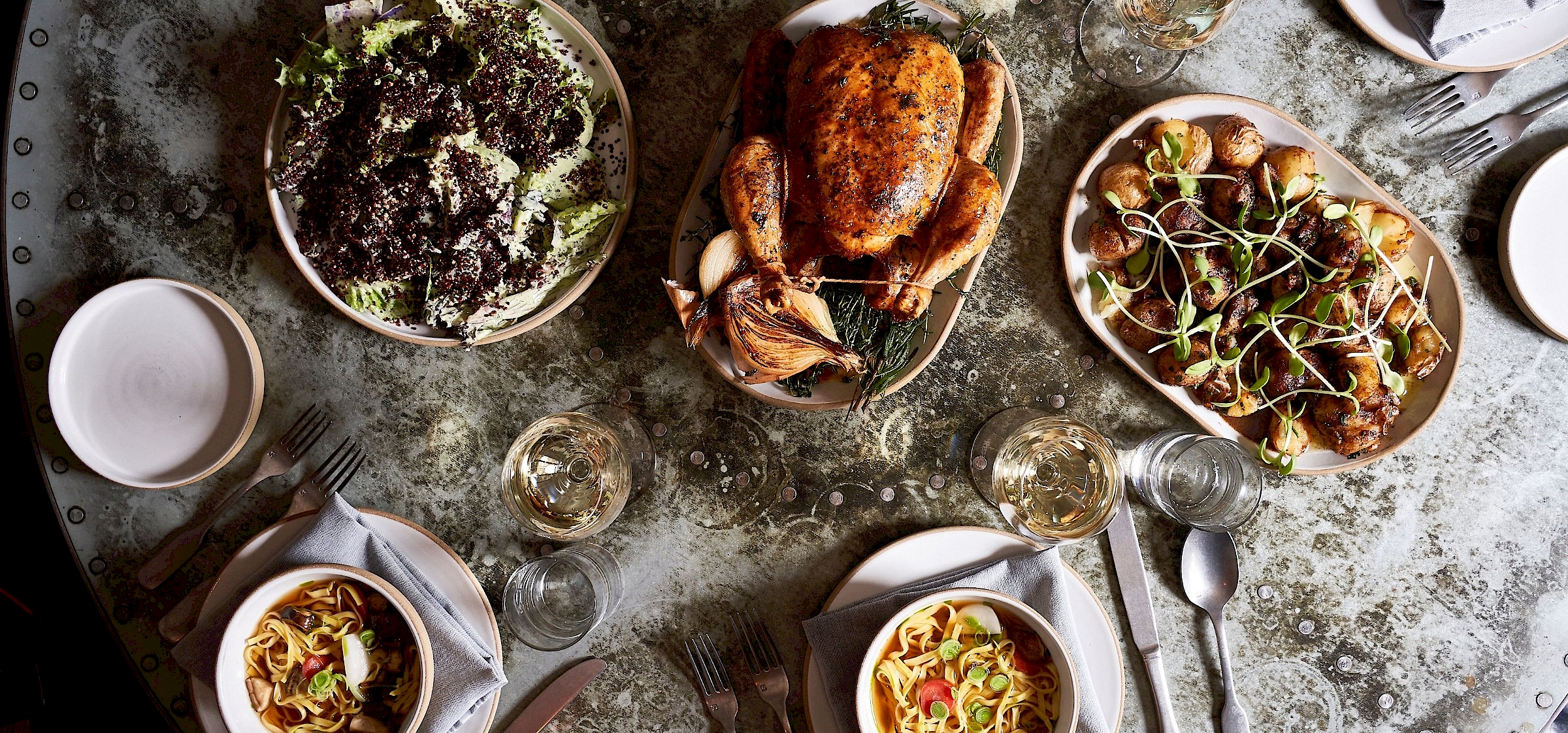 This Tuesday, January 20, Executive Chef Vincent Gilberti adds a new feature to his celebrated dinner menu: Whole Roast Chicken Dinners — with local chickens, of course. Up to four guests will start with bowls of exquisitely clear chicken consommé with shitake mushrooms from Tivoli Mushrooms and house-made black emmer-flour noodles from wheat grown and milled at Wild Hive Farm in nearby Clinton Corners, NY, followed by a whole roast chicken, presented tableside and then carved and served with Roasted Upstate Abundance potatoes with black garlic vinegar and a plentiful salad of young lettuces, radishes and herb buttermilk dressing. The side will change seasonally.