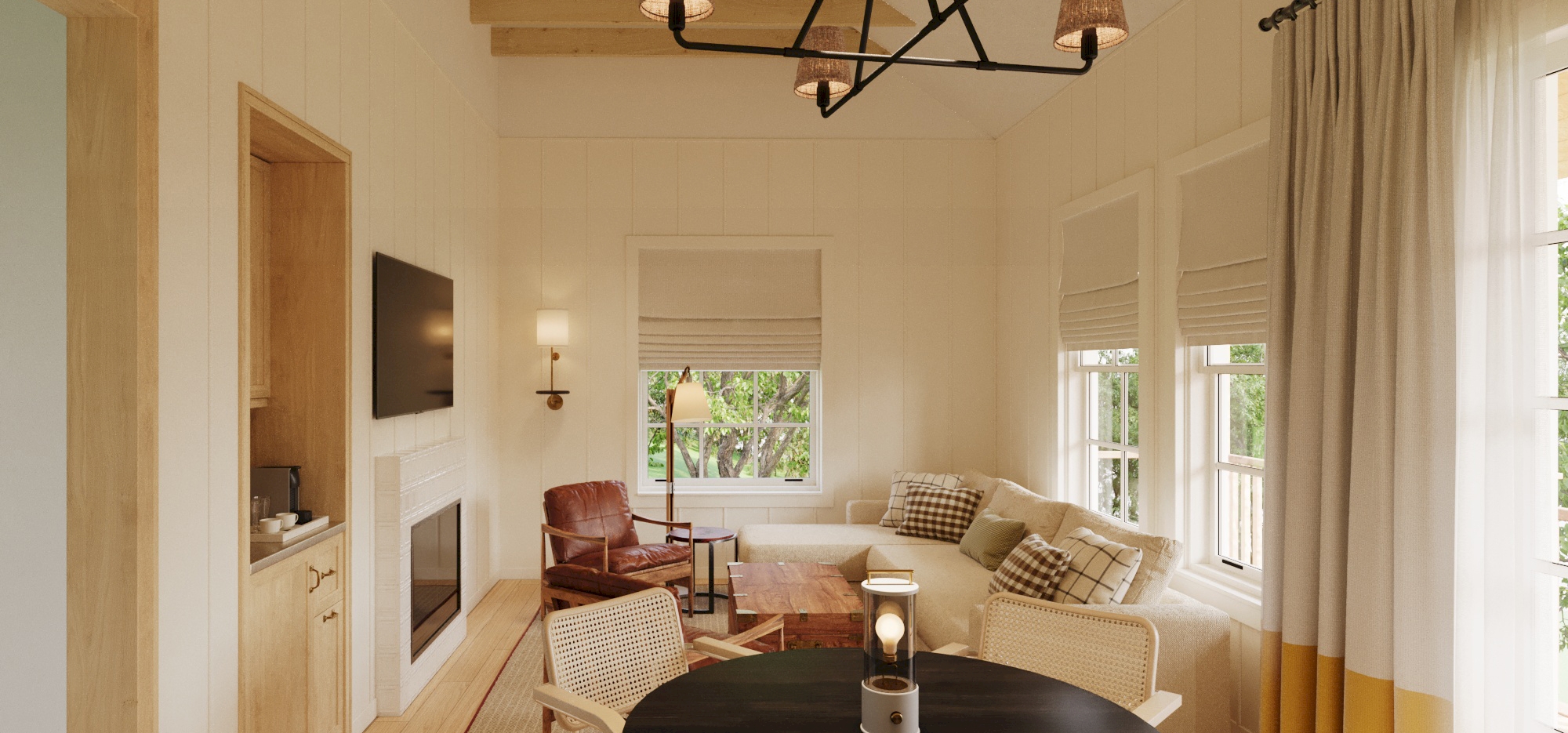 Our Two-Bedroom River Cottage echoes the natural tones and textures of Benton House (renovated in 2021), and reflect interior design elements seen throughout the property, such as four-poster king-sized beds by Ian Ingersoll made in nearby Cornwall, CT, and ceramic lamps by Dumais Made in Bantam, CT, with window treatments in Champalimaud Design for Holland & Sherry fabrics constructed by local outfitter Lakeville Interiors. Antique trunks as coffee tables and Marcel Breuer chairs continue the “quintessentially Troutbeck” timeless atmosphere, while Hoosier-style cabinets house stocked minibars, and gas fireplaces complete the self-contained understated-but-luxurious country house experience. All accommodations offer Frette bed linens and bathrobes, 42" Flat panel television, Bluetooth-enabled Tivoli Audio radio, Nespresso machine and bath products by Wildsmith, the plant-powered, 100% cruelty-free skincare line out of the United Kingdom, and more.